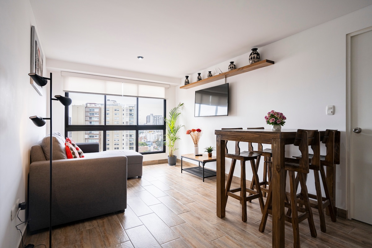 Stay in a luxury studio condo in a safe, gated community. Have your morning coffee on the balcony as you take in the beautiful 7th floor beachfront views, then walk 5 minutes into Barranco. Key Features: *Safe, gated community *Beach view with large windows & balcony *5 min walk into Barranco *Free parking within the gated community *Washer/dryer in unit *Basic kitchen essentials *55” smart TV on swivel mount *One queen sized bed & one sofa bed *24/7 concierge *Gym *Kids play room