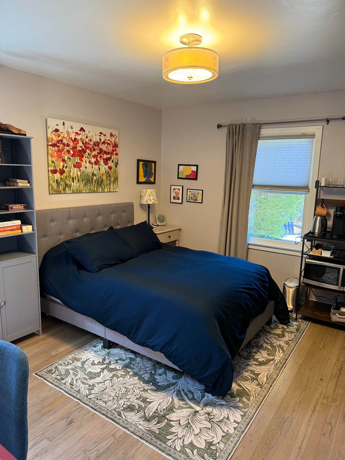สตูดิโอขนาดประมาณ 500 ตร.ฟ. ของเราใช้เวลาขับรถไม่นานจากวิทยาเขต UC เดวิสและอยู่ในระยะเดินถึงสองสายรถเมล์ สตูดิโอตั้งอยู่เหนือโรงจอดรถแยกต่างหากจากบ้านหลักของเราให้ความเป็นส่วนตัวและความสะดวกสบาย ห้องพักมีห้องครัวพร้อมอุปกรณ์ทำอาหารจำเป็น ห้องอาบน้ำส่วนตัว และตู้เสื้อผ้าแบบเดินเข้าได้ มีเครื่องซักผ้าและเครื่องอบผ้าในโรงรถให้ผู้เข้าพักใช้ นอกจากนี้ยังมีอินเทอร์เน็ตความเร็วสูงและเคเบิลทีวีผ่าน Xfinity ให้บริการด้วย