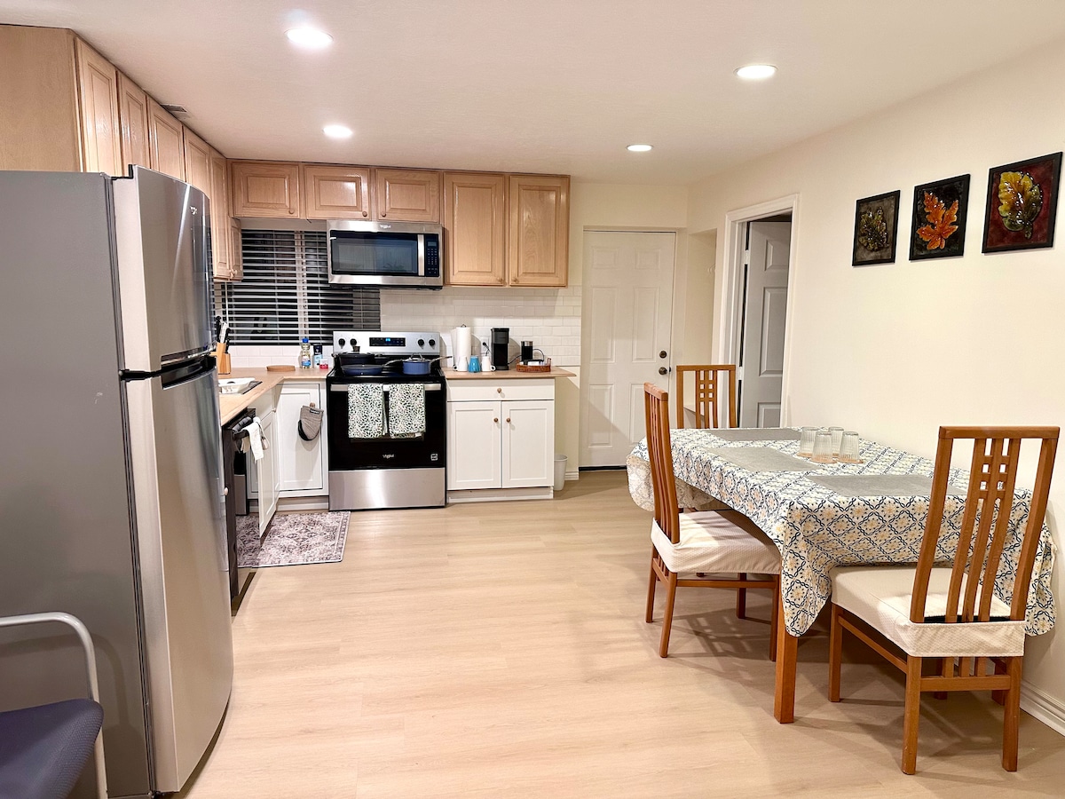 อพาร์ทเมนท์ใต้ดินตกแต่งใหม่เป็นส่วนตัวมีทางเข้าแยกต่างหากที่พักของเราเป็นอพาร์ทเมนท์แบบสตูดิโอขนาดใหญ่พร้อมห้องครัวขนาดใหญ่เครื่องซักผ้าและเครื่องอบผ้าสำหรับการใช้งานส่วนตัวของคุณ ** โปรดทราบว่าด้านบนอพาร์ทเมนท์เป็นพื้นที่ครัวของเจ้าของที่พักครอบครัวที่มีสมาชิก 7 คนอาศัยอยู่ในบ้านอาจมีการจราจรทางเท้าและเสียงรบกวนพอสมควร** ห่างจากสนามบิน SLC ประมาณ 15 นาที 37 นาทีสโนว์เบิร์ด 27 นาทีถึงตัวเมืองซอลต์เลกการเช่านี้กำหนดให้ผู้เช่าสามารถลงบันไดได้อย่างปลอดภัย