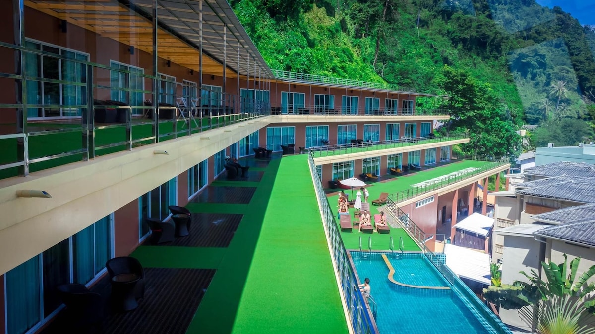 The accommodation is in Ao Nang, in a quiet but convenient neighborhood. Every room has a private jacuzzi on the balcony where you can relax and drink wine with your loved one while admiring the natural beauty of Krabi. Some nearby tourist attractions include Ao Nang Beach, Nopparat Thara Beach, the only large golden Buddha in Ao Nang, also known as Kuan Yin Bodhisattva Hill, Ao Nam Mao Pier to Railay Beach, and Shell Cemetery.