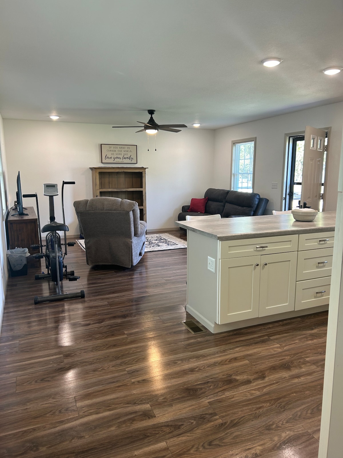 พื้นที่เปิดโล่งขนาดใหญ่พร้อมโซฟาพื้นที่เพียงพอสำหรับเด็กและของเล่น ห้องครัวขนาดเล็กพร้อมเตา ตู้เย็น และไมโครเวฟ ที่นี่เคยเป็นห้องทำงานห้องครัวและอ่างอาบน้ำมีขนาดเล็กแต่ทุกอย่างอยู่ที่นั่น เครื่องใช้ในครัวขนาดเต็มทั้งหมด ต่อมาได้ใช้เป็นที่พักให้เช่า จึงได้ติดตั้งเครื่องซักผ้า เครื่องอบผ้า และฝักบัว ซึ่งอธิบายได้ว่าทำไมเครื่องใช้ไฟฟ้าถึงไม่ได้ติดตั้งตามที่ปกติ เนื่องจากอยู่ติดกับทางหลวงหมายเลข 36 จึงเข้าออกได้ง่าย ใกล้เมือง (1 1/2 ไมล์ถึงวอลมาร์ท)