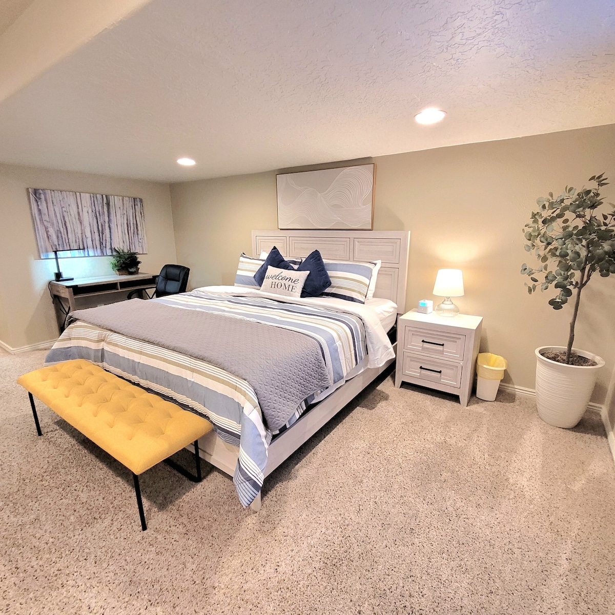 Bright, private guest suite just 12 mins from SLC Airport! This spacious home features 2 queen beds, a queen air mattress, and a convertible couch. Enjoy Wi-Fi, a full kitchen, peaceful workspace, cozy electric fireplace, TV, yoga corner, and coffee bar. Keyless entry makes check-in simple. Close to Saltair, skiing, downtown SLC, and the Great Salt Lake. This home is NOT a fit for parties and does have another unit upstairs. Violations are reported. We look forward to hosting you!