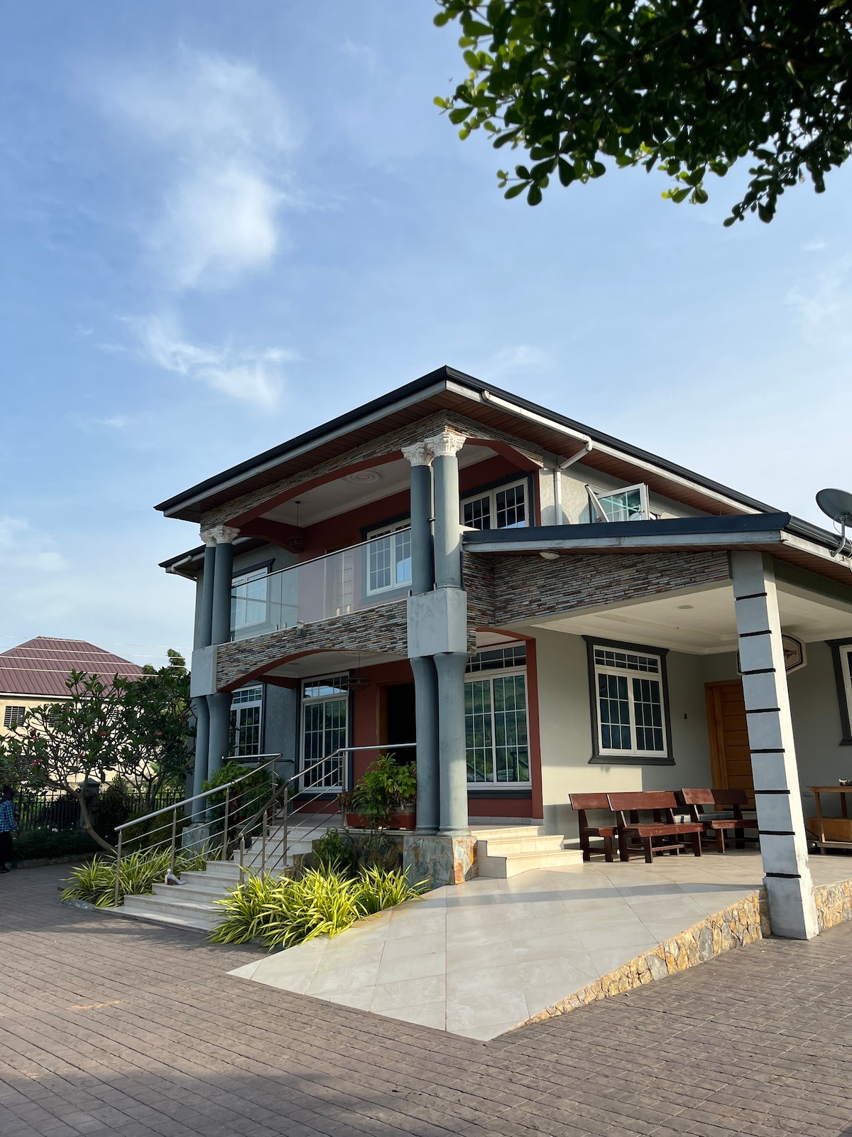 Step into a luxurious, comfortable, and modern home, built with every care in mind. Filled with thoughtful amenities and features that allow you to take in ultimate relaxation. Whether your stay is business, family, or vacation related you will surely find all you need and more. This traditional family style Ghanian neighborhood and family plot, lets you feel at home, no matter where you are from. Come experience the beautiful authentic eastern region in style, comfort and luxury!