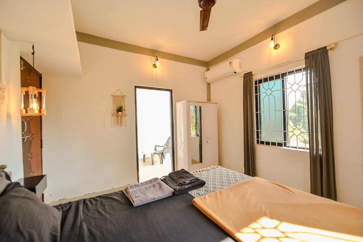 ได้รับการรับรองจากสำนักงานท่องเที่ยวกัว อพาร์ทเมนท์ปรับอากาศขนาด 950 ตารางฟุต: ห้องนอน 2 ห้องน้ำทีวี/ห้องนั่งเล่นห้องครัวแบบเปิดมุมซักรีด + พื้นที่ที่ไม่มีเครื่องปรับอากาศ 500 ตารางฟุต: รับประทานอาหารสำหรับ 4 ท่านห้องอาบแดดลานร่มรื่นระเบียงกลางแจ้ง อินเทอร์เน็ต 300mbps; พลังงานสำรอง 4-5 ชม.; สมาร์ททีวีขนาด 50 นิ้ว; หนังสือ; เกมกระดาน; สถานีทำงานและที่จอดรถในร่ม ตั้งอยู่ใน Porvorim: 15 นาที Panaji/Mapusa; 25 นาที Calangute/Baga; 30 นาที Anjuna/Vagator; 45 -60 นาที Ashvem/Mandrem/Arambol; ชายหาด South Goa 60 -75 นาที; 120 นาที Palolem