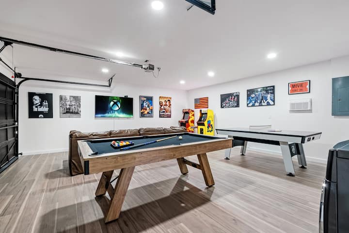 ห้องเกมในโรงรถเป็นสวรรค์สำหรับผู้ที่ชื่นชอบความบันเทิงมีทีวีจอใหญ่ระบบวิดีโอเกม Xbox โต๊ะพูลปิงปอง/แอร์ฮอกกี้และตู้วิดีโอเกมอาร์เคด เรามีบอร์ดเกมมากมายสำหรับทั้งครอบครัว ชั่วโมงแห่งความสนุกรอคุณและผู้เข้าพักอยู่ที่บ้านเลย!