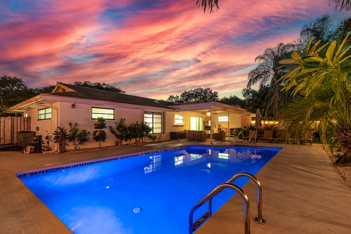 สวนหลังบ้านสไตล์ทรอปิคอลมีรั้วล้อมรอบ พร้อมลานในร่มและเก้าอี้นอนสำหรับอาบแดดข้างสระว่ายน้ำอุ่นฟรี อ่างน้ำร้อน ซาวน่า เตาย่างบาร์บีคิว ทีวีกลางแจ้ง และอ่างน้ำเย็น เพลิดเพลินกับค็อกเทลริมสระว่ายน้ำที่มีร่มเงาหรือแสงแดดมากมายไม่ว่าคุณจะชอบแบบไหน!