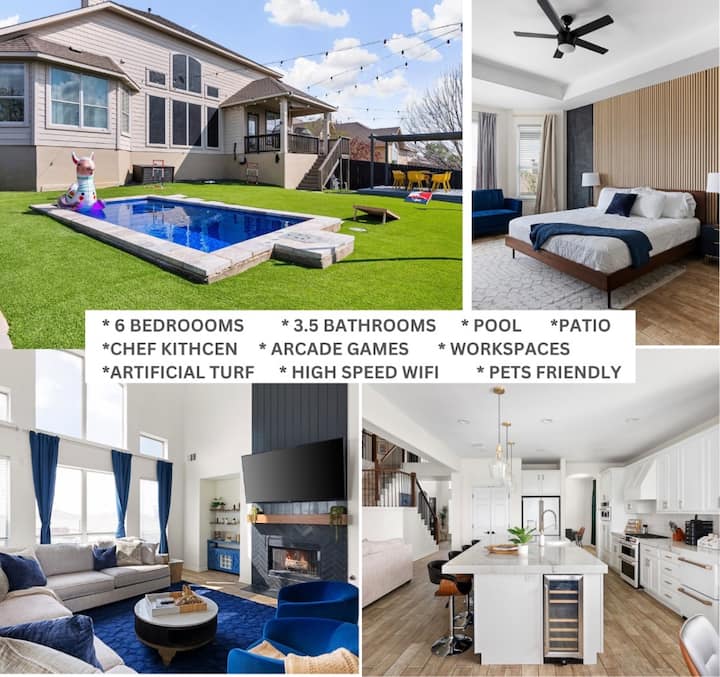 ✨✨ดื่มด่ำกับความหรูหราในพื้นที่ 3,350 ตารางฟุตของเรา ที่พัก Round Rock ห่างจากเดอะโดเมนหรือใจกลางเมืองออสตินเพียง 30 นาที! ที่พักระดับไฮเอนด์แห่งนี้มีจิตรกรรมฝาผนังที่วาดด้วยมือ สระว่ายน้ำส่วนตัว ห้องครัวสำหรับเชฟ และพื้นที่กว้างขวาง อยู่ห่างจากคาลาฮารีรีสอร์ทและเดลไดมอนด์เพียงไม่กี่นาที เหมาะสำหรับทริปเป็นกลุ่ม การพักผ่อนกับครอบครัว หรือการเข้าพักขององค์กร เพลิดเพลินกับความบันเทิงไม่หยุดหย่อนในห้องเล่นเกมและความสะดวกสบายของบ้านส่วนตัวที่เข้าถึงฉากที่มีชีวิตชีวาของออสตินได้ง่าย จองที่พักสุดประทับใจวันนี้เลย! ✨✨