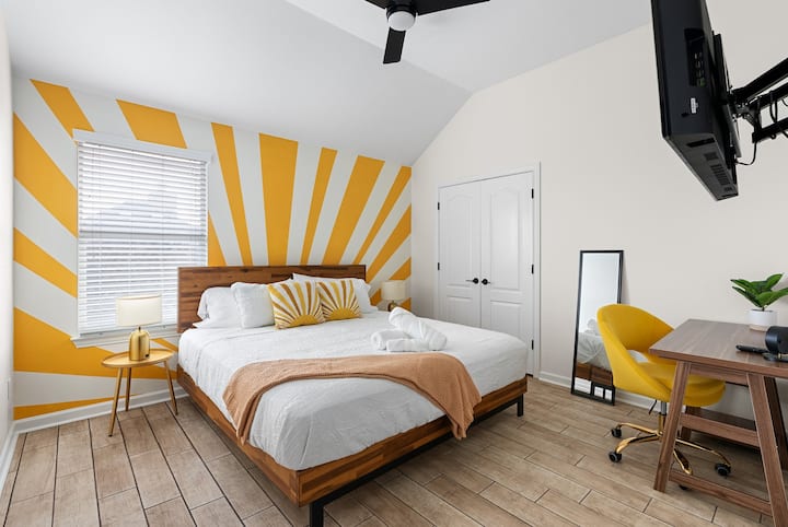 • ห้องสีเหลือง: เตียงคิงไซส์ จิตรกรรมฝาผนัง โต๊ะทำงาน ทีวีขนาด 55”