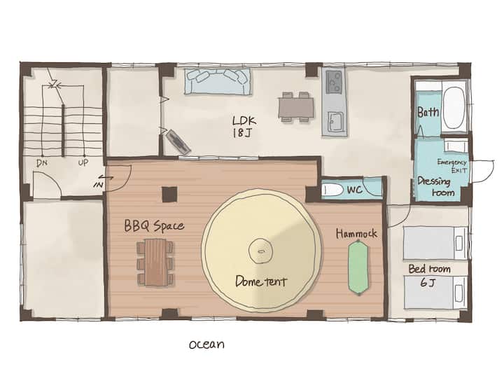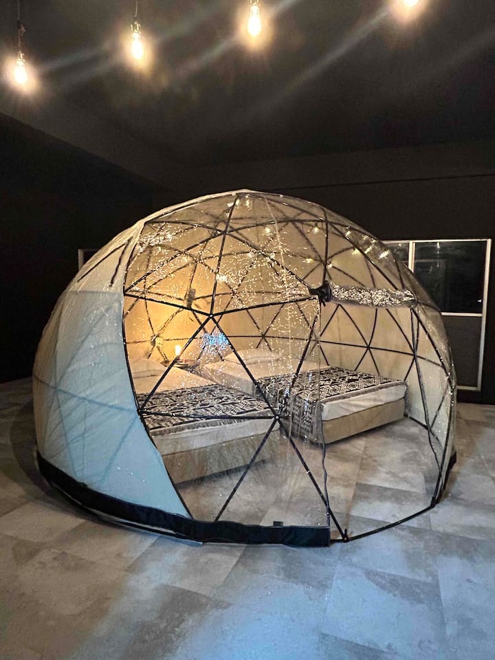 พื้นที่สำหรับผู้ใหญ่ที่มีเต็นท์โดมบนระเบียงด้านใน