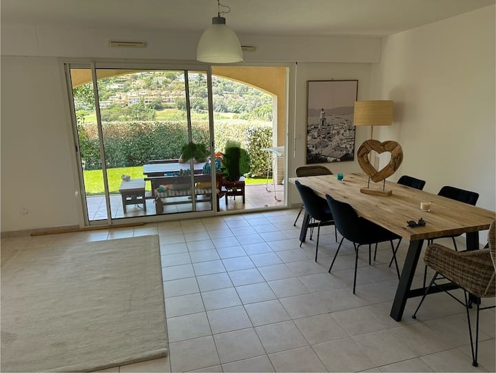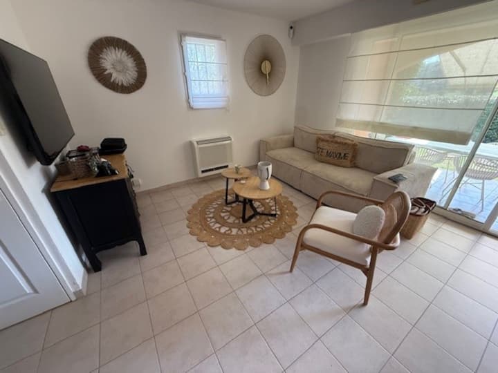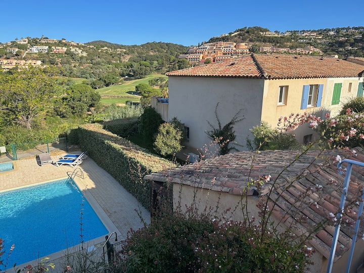 เมซซ์ที่มีเสน่ห์พร้อมเครื่องปรับอากาศ 2 ห้องนอนในที่พักส่วนตัวพร้อมสระว่ายน้ำ ระเบียงกว้างขวางพร้อมแผนชา สวน และทางเข้าสระว่ายน้ำโดยตรง วิวพาโนรามาของสนามกอล์ฟแซ็ง-แม็กซีมและวิวทะเล ทำเลที่ตั้งดีเยี่ยม: ชายหาด 3 นาทีโดยรถยนต์ ใจกลางเมือง 1.5 กม. และแซงต์-โทรเป 18 กม. เหมาะสำหรับวันหยุดที่สงบสำหรับครอบครัวหรือกลุ่มเพื่อน