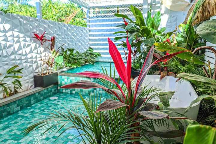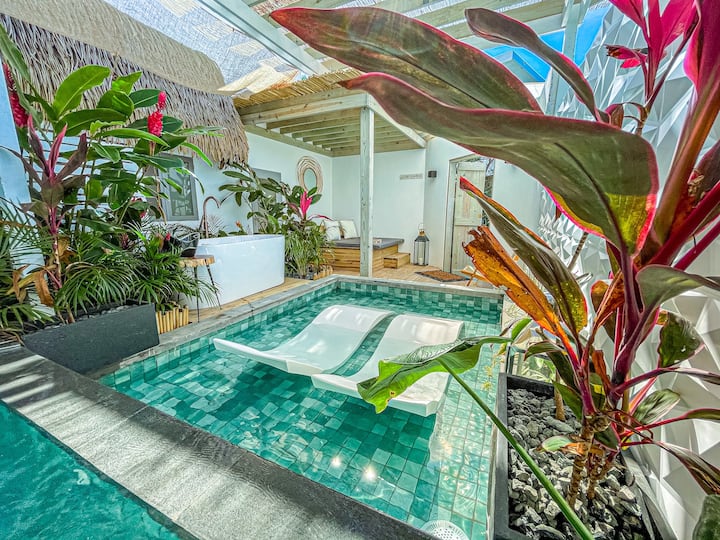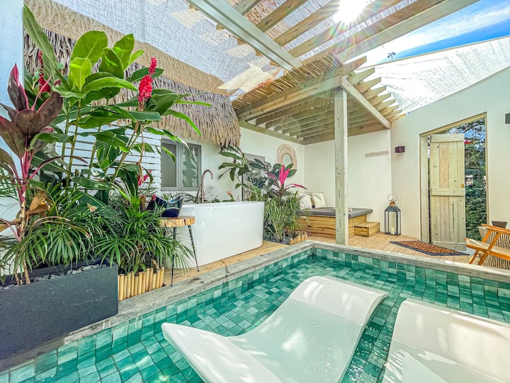 ห้องสวีทสระว่ายน้ำส่วนตัวและอ่างอาบน้ำด้านนอกในป่า