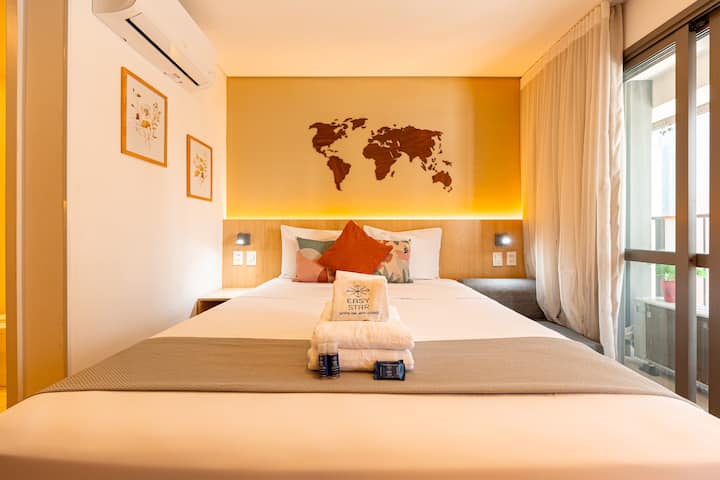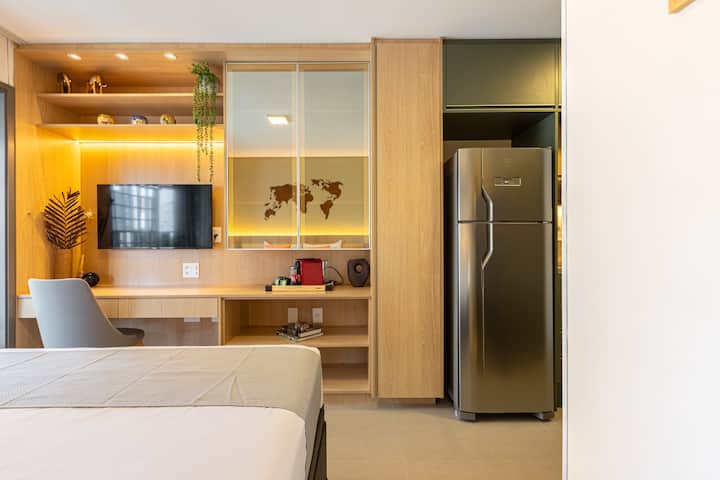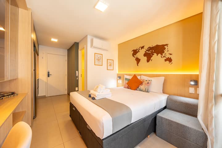 ยินดีต้อนรับสู่สตูดิโอที่อบอุ่นของเราตกแต่งด้วยความรักที่ยอดเยี่ยมเพื่อต้อนรับคุณอยู่ใจกลางย่าน Campo Belo รองรับคนสองคนในเตียงคู่มาตรฐานได้อย่างสะดวกสบาย