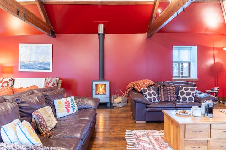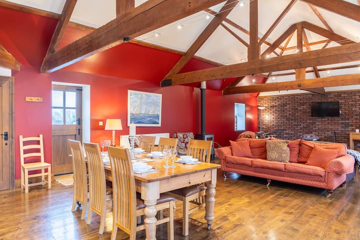 มีพื้นที่รับประทานอาหารและพื้นที่นั่งเล่นขนาดใหญ่พร้อมเตาเผาไม้