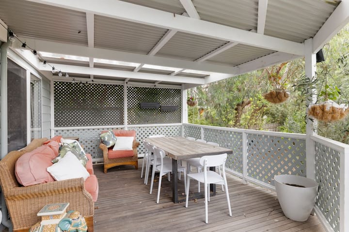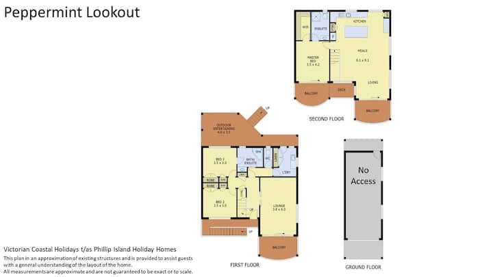 การเข้าถึงที่พักผ่านทางบันไดด้านนอกไปยังทางเข้าชั้น 1 มีระเบียงด้านหน้าที่มีหลังคาและด้านหลังมีพื้นที่ให้ความบันเทิงเต็มรูปแบบ (มีเตาบาร์บีคิวและโต๊ะและเก้าอี้สำหรับ 8 คน) ชั้นสองมีระเบียง (มีเก้าอี้ 2 ตัว) ที่มองออกไปเห็น Kilcunda ไปยังมหาสมุทรและข้ามพื้นที่ชนบทอันงดงาม ยังมีระเบียงส่วนตัวและดาดฟ้านอกห้องนอน 1 (พร้อมโซฟา 3 ที่นั่ง) ทั้งตึกล้อมรอบและลานด้านหลังมีแทรมโพลีนและบั้งไฟล้อมรอบ (ไม่มีไม้ให้) โรงรถไม่ได้มีไว้ให้ผู้เข้าพักใช้แต่มีพื้นที่จอดรถได้สูงสุด 3 คัน (รถยนต์และ/หรือเรือ) บนทางเข้าบ้าน