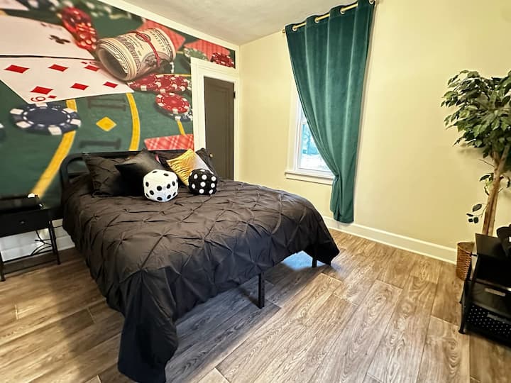 โอบกอดความตื่นเต้นในการไป "All In" ในห้องพักที่น่าหลงใหลพร้อมเตียงควีนไซส์การตกแต่งในธีมคาสิโนที่ไม่เหมือนใครและบรรยากาศที่สมบูรณ์แบบสำหรับการนอนหลับพักผ่อน
