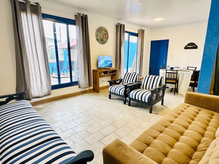 บ้านสีเหลืองพร้อมสระว่ายน้ำและบาร์บีคิวใกล้ชายหาด