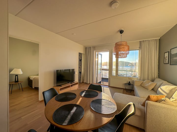 ห้องสองห้องพร้อมซาวน่าและระเบียงที่มองเห็นท่าเรือ