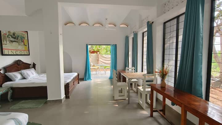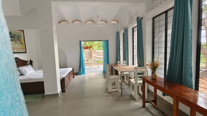 เราเป็นชุมชนออโรวิลล์บนชายหาด คุณสามารถมาเพลิดเพลินกับห้องพักหรือบ้านหลังเล็กๆพร้อมสระว่ายน้ำและอาหารเช้ารวมอยู่ด้วย