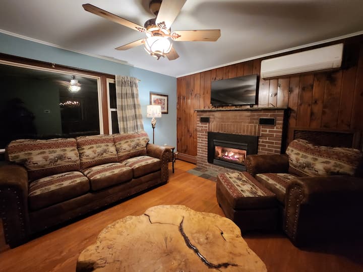 ห้องนั่งเล่นที่อบอุ่นของเรามีโซฟาเต็มรูปแบบเก้าอี้นั่งสบายและออตโตมันตั้งอยู่รอบเตาผิงแก๊สที่ลุกโชน เริ่มต้นเท้าของคุณและผ่อนคลายหลังจากการผจญภัยมาทั้งวัน – สำหรับผู้ที่อยู่ในปาร์ตี้ของคุณที่เพลิดเพลินกับความสงบและความเงียบของการพักผ่อนที่บ้านจะมีสถานที่ที่ดีกว่าติดกับภูเขา! ในสภาพอากาศที่อบอุ่นขึ้นเพลิดเพลินกับแสงแดดบนดาดฟ้าด้านหลังหรือสำรวจสวนหลังบ้านขนาดใหญ่ของเราที่ฐานของเนินเขา พื้นที่รับประทานอาหารและพื้นที่นั่งเล่นเป็นแบบเปิดโล่งบางส่วนมีหน้าต่างรูปจำนวนมากมองเห็นวิวที่น่ารื่นรมย์ ชุดรับประทานอาหารรองรับได้ 8 ที่นั่ง ห้องครัวแบบรับประทานอาหารแบบใหม่ของเราพร้อมตู้เชอร์รี่ท็อปเคาน์เตอร์หินแกรนิตและเครื่องใช้ไฟฟ้าใหม่ของ GE สามารถมองเห็นวิวสวนหลังบ้านที่กว้างขวางและวิวที่กรองของพื้นที่เล่นสกี มีอุปกรณ์ทำอาหารพื้นฐานทั้งหมด - หม้อและกระทะรวมถึงอุปกรณ์รับประทานอาหารค่ำโปรดอย่าลืมนำเครื่องเทศหรือของพิเศษที่คุณอาจต้องการมาเอง ห้องน้ำเต็มรูปแบบ 2 ห้องของเรามีที่อาบน้ำฝักบัวแบบยืน 5 ฟุตในห้องหนึ่งและอ่างอาบน้ำ/ฝักบัวแบบดั้งเดิมในอีกห้องหนึ่ง ห้องนอนใหญ่มีเตียงคิงไซส์ hickory log พร้อมที่นอนโฟมหรูหราติดผนังเครื่องปรับอากาศและพื้นที่ตู้เสื้อผ้ามากมาย ห้องพักสีฟ้ามีเตียงขนาดควีนไซส์ไม้ซีดาร์ที่สวยงามตู้เสื้อผ้าและเครื่องปรับอากาศแบบแยกส่วนขนาดเล็กแบบไม่มีท่อ ห้องพักสีเขียวของเรามีเตียงสองชั้นคู่ไม้ซีดาร์และเตียงแฝดเพิ่มเติม ที่ชั้นใต้ดินชั้นโรงรถมีห้องสำเร็จรูปที่ให้พื้นที่สังสรรค์ที่ดีพร้อมเตาผิงแก๊สที่สองโต๊ะเกมที่มีวิธีสนุกมากมายกับครอบครัว (โต๊ะหมุนหลายเกมมีฮอกกี้อากาศสระว่ายน้ำและฮอกกี้อากาศ) แสงสว่างแบบปิดภาคเรียนพื้นที่ตู้เสื้อผ้ามากมายโต๊ะเกมและฟูก (สำหรับผู้เข้าพักคนที่ 8) ในส่วนที่ไม่มีการตกแต่งของชั้นใต้ดินที่อยู่ติดกับโรงรถเรามีเครื่องซักผ้าและเครื่องอบผ้าและมีพื้นที่เพียงพอสำหรับรองเท้าบูทและอุปกรณ์ ผู้เข้าพักสามารถใช้โรงรถสำหรับรถยนต์หรืออุปกรณ์เช่นสกีจักรยานและของเล่น