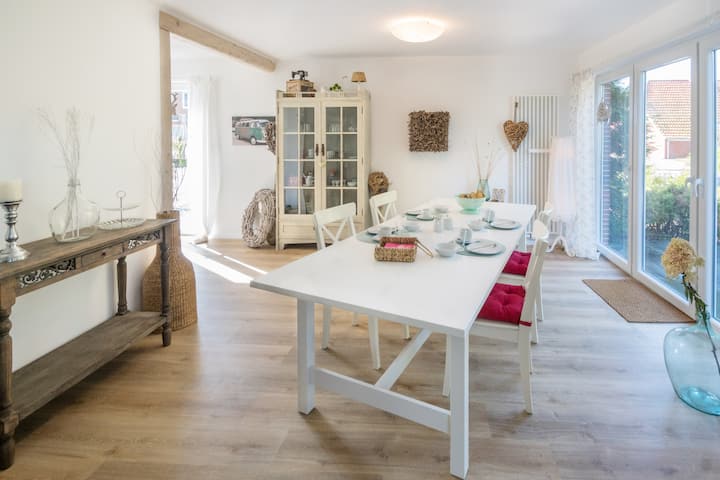 บ้านพักตากอากาศตกแต่งทันสมัยและมีคุณภาพสูงพร้อมลานระเบียง 2 หลังและที่จอดรถ 3 คันบ้านพักตากอากาศตกแต่งใหม่ปี 2017 พร้อมพื้นที่ขนาดใหญ่ เรายินดีต้อนรับคุณสู่บ้านพักตากอากาศของเราพอลลี่ Ferienhaus Polly เป็นบ้านชนบทที่ได้รับการปรับปรุงใหม่ทั้งหมดและตั้งอยู่ใน North Sea SPA DornumDornumersiel ที่ Lower Saxony Wadden Sea National Park ซึ่งเป็นแหล่งมรดกโลกขององค์การยูเนสโกตั้งแต่ปี 2009 คอทเทจอยู่ใน