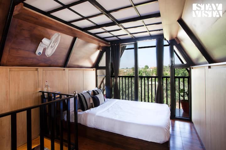ห้องนอนที่มีเสน่ห์แห่งนี้ตั้งอยู่บนชั้นแรกมีระเบียงเผยให้เห็นทิวทัศน์อันน่าทึ่งของอ้อมกอดอันเขียวขจีของป่าไม้ล้อมรอบ