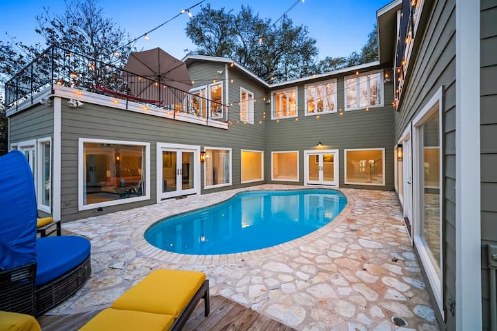 สระว่ายน้ำลึก 8 ฟุตล้อมรอบด้วยห้องนอนและเข้าถึงได้จากทุกที่ในชั้นล่างทำให้มั่นใจได้ว่าจะได้รับความสดชื่นพร้อมวิวที่ดีที่สุดในออสติน