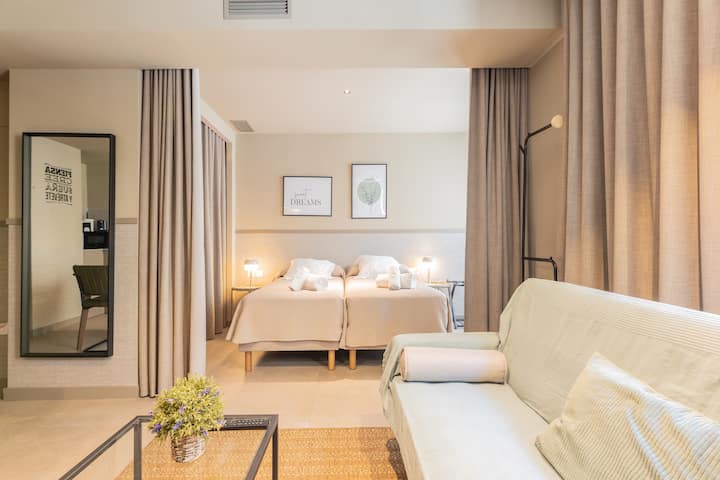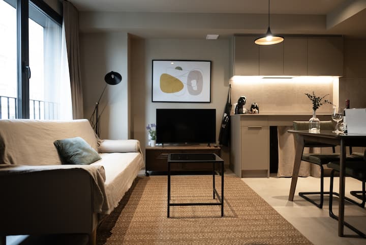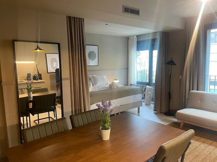 อพาร์ทเมนท์ลอฟท์มีห้องนอนแยกจากห้องนั่งเล่น/ห้องครัวด้วยม่าน ประกอบด้วยหน้าต่างบานใหญ่ที่มีรอยขูดขีดเพื่อบดบังห้องอย่างสมบูรณ์ มองเห็นถนนที่คุณสามารถชื่นชมต้นไม้ในแม่น้ำและ Corte Ingles