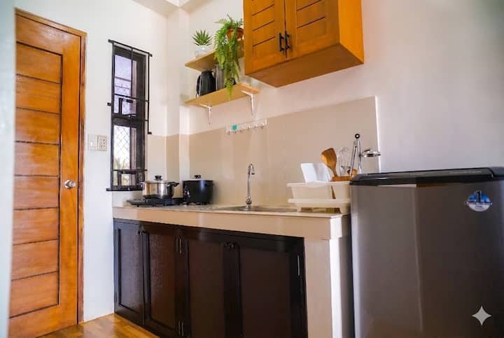 🍳 ห้องครัวพร้อมอุปกรณ์ครบครันพร้อมอุปกรณ์ทำอาหารและรับประทานอาหาร ตู้เย็น กาต้มน้ำ และหม้อหุงข้าว