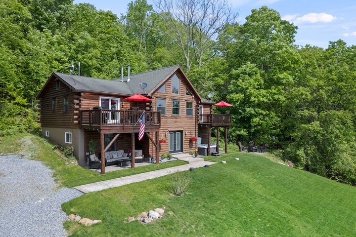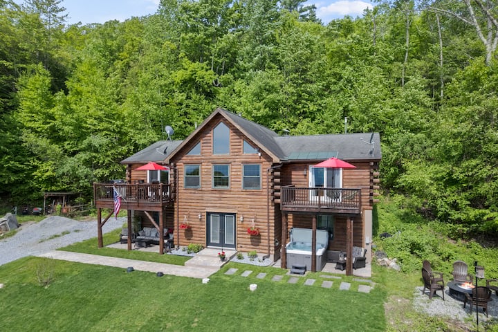 Log Home, 4 ห้องนอนและ 4 ห้องน้ำเต็มรูปแบบพร้อมลอฟท์เพิ่มเติมที่มีเตียงแฝด 2 หลังนอก 10 จุดนอนที่โฆษณาไว้ บ่อน้ำส่วนตัวพร้อมชายหาดแพและที่ก่อกองไฟ
