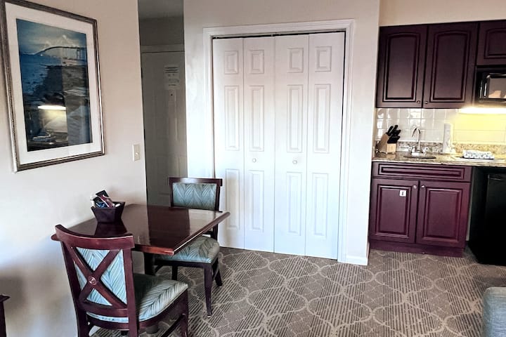 ในพื้นที่นั่งเล่นมีโต๊ะรับประทานอาหารและเก้าอี้โซฟาเบดขนาดควีนไซส์ที่สะดวกสบายมากทีวีและเก้าอี้นวมที่หรูหราและผ่อนคลายสำหรับการอ่านหนังสือหรือนั่งพักผ่อน เมื่อคุณกลับมาจากวันที่วุ่นวายของการสำรวจเตียงควีนไซส์ไม่แข็งเกินไปไม่นุ่มเกินไปประดับประดาด้วยหมอนหนานุ่มและผ้าห่มนุ่มๆชวนให้คุณพักผ่อนในโลกแห่งความสะดวกสบาย ผ้าลินินสีขาวที่คมชัดให้ความรู้สึกเหมือนก้อนเมฆกับผิวของคุณเพิ่มความสง่างามให้กับเตียงที่น่าอยู่แล้ว มีทีวีในห้องนอนด้วย ห้องน้ำส่วนตัวเต็มรูปแบบมีที่อาบน้ำ/อ่างอาบน้ำผ้าปูที่นอนสำหรับ 4 คนไดร์เป่าผมและของใช้ในห้องน้ำฟรี