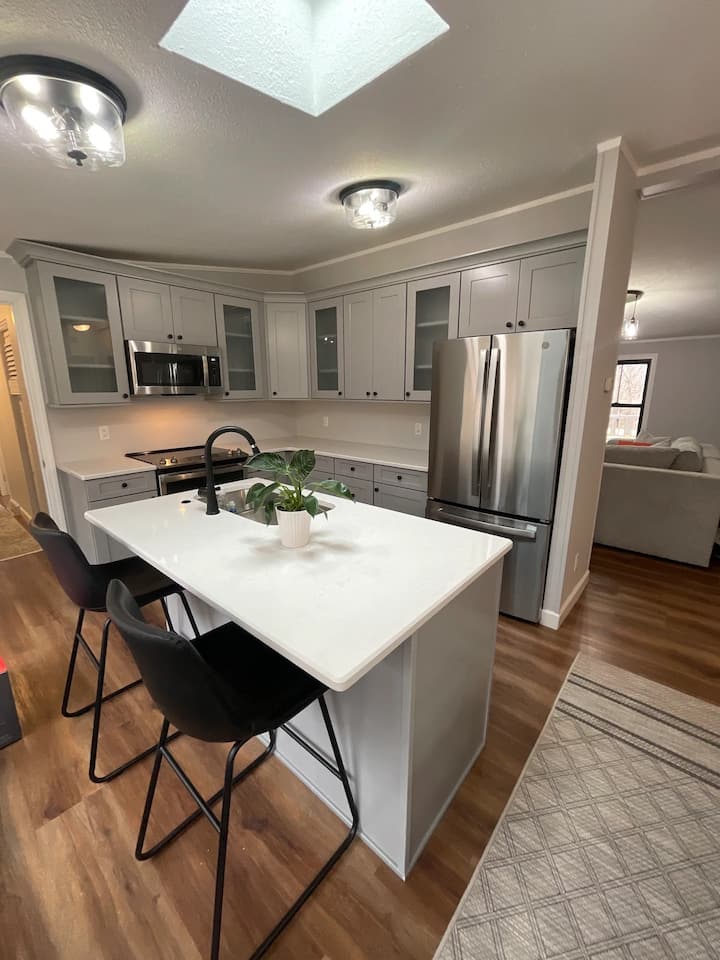 หน้าต่างบานใหญ่ 4 บานทางด้านตะวันตกของบ้านและช่องแสงให้แสงธรรมชาติเพียงพอในพื้นที่รับประทานอาหารและห้องครัวแบบเปิดโล่ง โต๊ะรับประทานอาหารรองรับได้ 6 ที่นั่งและ Kitchen Island มีเก้าอี้บาร์ 2 ตัว ผู้เข้าพักจะเพลิดเพลินไปกับห้องครัวที่มีอุปกรณ์ครบครันพร้อมเครื่องใช้ไฟฟ้าใหม่ล่าสุดรวมถึงเตาหุงต้มแบบกระจกไมโครเวฟตู้เย็น/ตู้แช่แข็งแบบเจาะลึกเครื่องล้างจานเครื่องกำจัดขยะเครื่องปั่น Keurig และเครื่องปิ้งขนมปัง นอกจากนี้ยังมีอุปกรณ์รับประทานอาหารเครื่องแก้วชุดมีดช้อนส้อมหม้อและกระทะแผ่นรองอบมีดและอุปกรณ์ทำอาหารพื้นฐาน