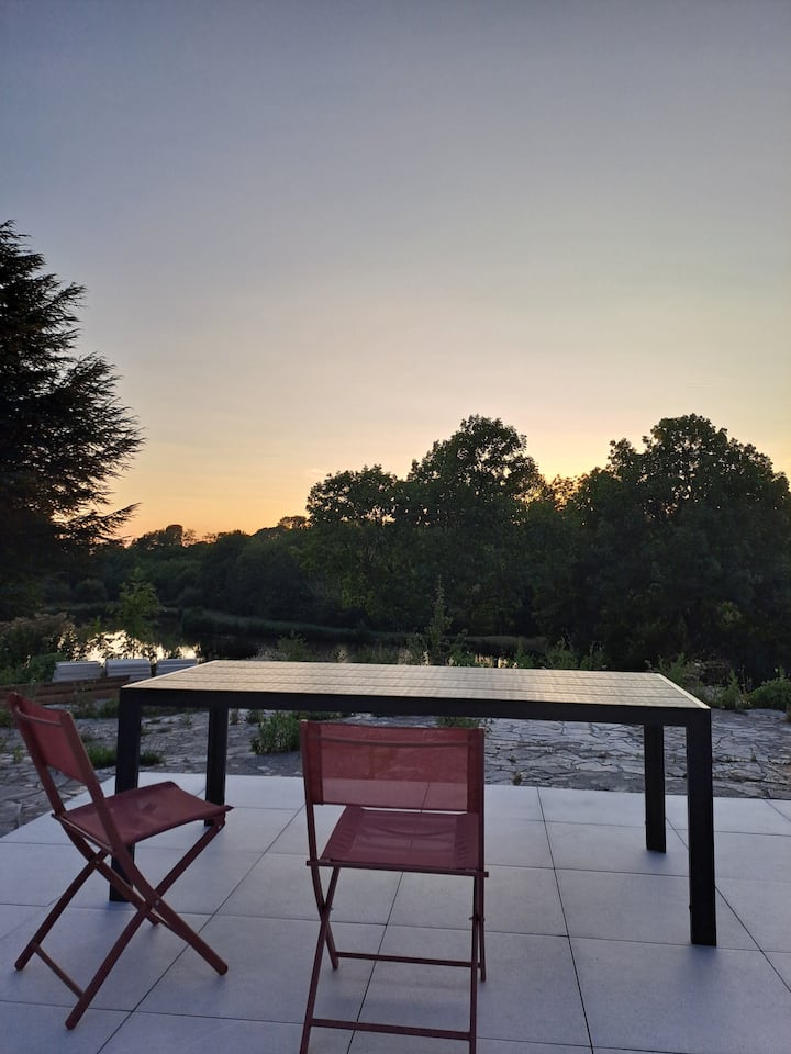 เราเข้าถึงชั้นล่างของที่พักโดยบันไดภายนอกที่มองเห็นระเบียงและห้องครัวโดยทำตาม วิวทะเลสาบของที่ดินที่น่าตื่นตาตื่นใจ (ห้ามว่ายน้ำ)