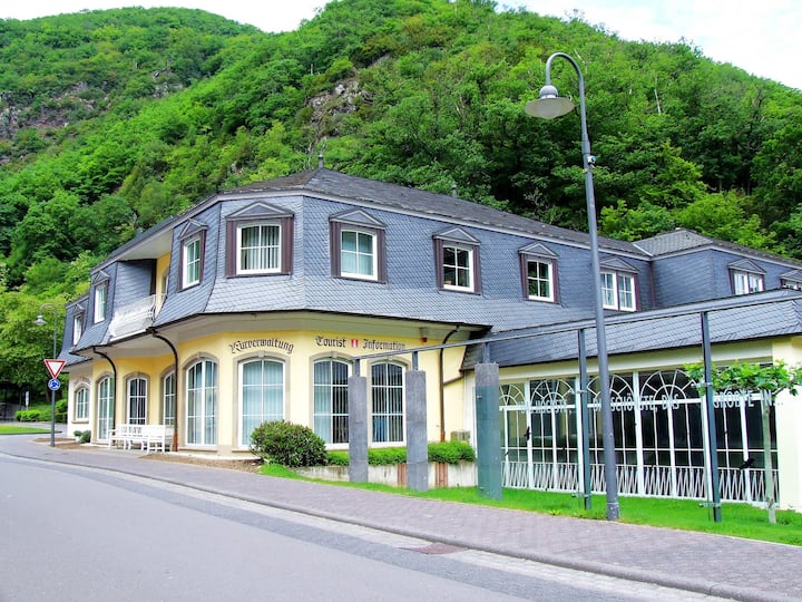Bad Bertrich ตั้งอยู่ตรงกลางระหว่างเมือง Koblenz และ Trier รวมถึง Bernkastel-Kues และ Cochem ภูมิภาคระหว่างเมืองประวัติศาสตร์เหล่านี้มีลักษณะเป็นธรรมชาติที่น่าทึ่ง ประวัติศาสตร์ที่อุดมสมบูรณ์ และสมบัติทางวัฒนธรรม ยินดีต้อนรับสู่บ้านพักตากอากาศของเรา Bad Bertrich ในทำเลที่เงียบสงบใจกลางเมือง ริมแม่น้ำ Mosel ตั้งแต่ Koblenz ไปจนถึง Trier มีไร่องุ่นที่สวยงามและเมืองที่มีเสน่ห์ Koblenz ตั้งอยู่ที่จุดบรรจบของแม่น้ำไรน์และ Mosel สร้างความประทับใจให้กับป้อมปราการ Ehrenbreitstein และมุมเยอรมัน เดินต่อไปตาม Mosel คุณสามารถไปถึง Cochem ด้วย Reichsburg และ Bernkastel-Kues ที่สวยงามด้วยบ้านครึ่งไม้ที่มีคุณค่าทางประวัติศาสตร์