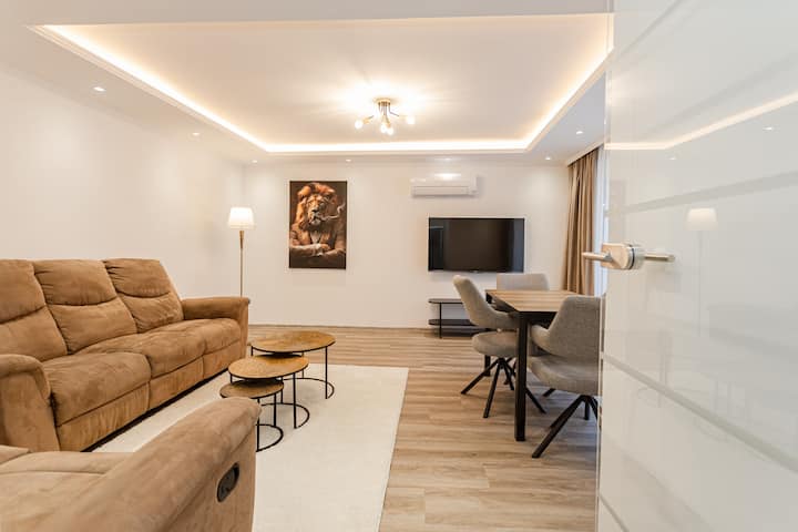 อพาร์ทเมนท์ชั้น 1 ที่กว้างขวางของเรามอบความสะดวกสบายทั้งหมดให้คุณได้รับประสบการณ์การเข้าพักที่น่าจดจำ ผ่อนคลายในห้องนั่งเล่นบนโซฟาหรือเก้าอี้นวมที่สะดวกสบาย และเพลิดเพลินกับรายการโปรดของคุณบนทีวีจอแบนขนาด 55 นิ้ว ห้องนอนทั้งสองห้องมีเตียงคู่ที่สะดวกสบาย รวมถึงโต๊ะข้างเตียง ตู้เสื้อผ้า และโคมไฟอ่านหนังสือเพื่อความสะดวกสบายของคุณ มีผ้าปูที่นอนและผ้าห่มผ้าวูลเตรียมไว้ให้คุณ