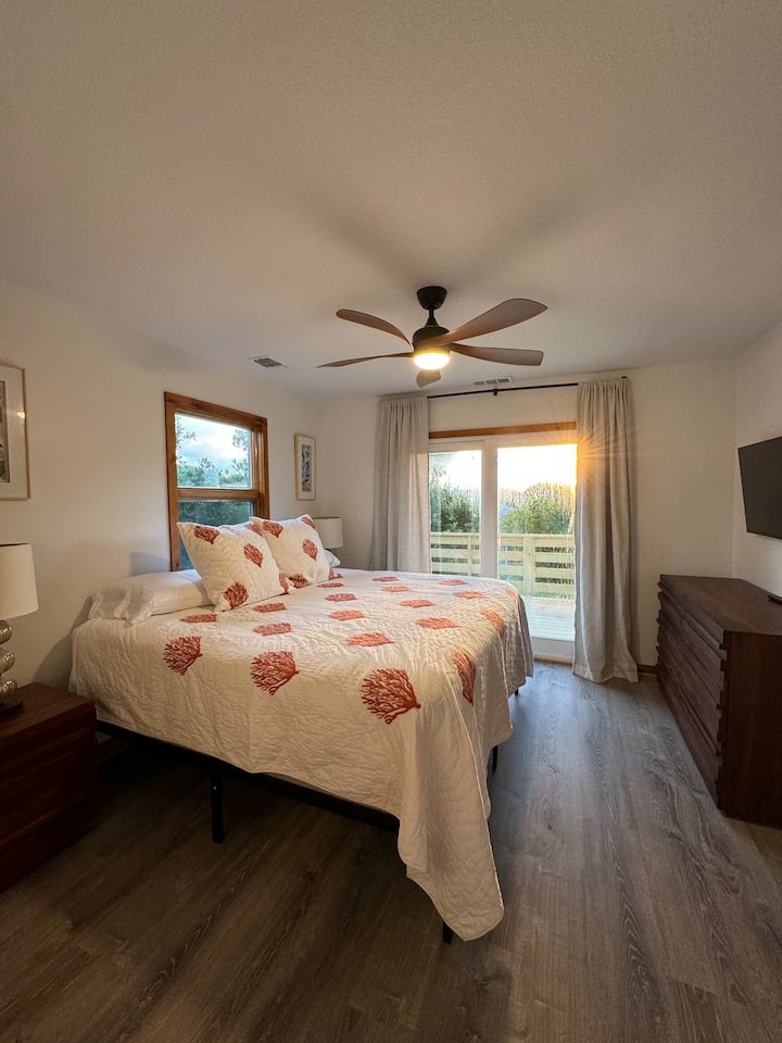 ยินดีต้อนรับสู่ Sunny Skies & High Fives ใน Nags Head ใกล้ Mile Post 11.5 Epitome of Country at the Beach. เดินไปชายหาดได้ไม่ไกลประมาณ 3 -5 นาที นี่คือบ้านที่เป็นมิตรกับสุนัขและมีสนามหลังบ้านขนาดใหญ่ ที่พักนี้ได้รับการทำความสะอาดและลดเชื้อโดยมืออาชีพ เปิดโล่ง ลอฟท์/ชั้นสูง: 4 ห้องนอน 2 ห้องน้ำเต็มรูปแบบ (เตียงคิงไซส์ 1 เตียง ควีนไซส์ 2 เตียง เตียงสองชั้นเต็มรูปแบบ 1 เตียง และเตียงสองชั้นคู่ 1 เตียง) มีฝักบัวอาบน้ำกลางแจ้งเตาเดี่ยวหลุมก่อไฟไร้ควันคอร์นโฮลไวไฟความเร็วสูงสมาร์ททีวีอยู่ในทุกห้อง The Sunny Skies cottage is a short walk to the Beach, Nags Head Pier and Galaxy Miniature Golf. นอกจากนี้ยังอยู่ใกล้โรงพยาบาล Outer Banks, Outlet Mall, ร้านขายของชำ, ร้านอาหารและ Jockey's Ridge ห้องสองชั้นแยกต่างหากชั้นล่างเป็นสถานที่ที่ยอดเยี่ยมสำหรับเด็กๆหรือผู้ที่ต้องการความเป็นส่วนตัวมากขึ้นและผู้ที่อาจมีปัญหาเกี่ยวกับบันได ด้านหลังมีดาดฟ้า/ชานบ้านขนาดใหญ่และระเบียงส่วนตัวชั้น 3 ด้านนอกห้องนอนคิงไซส์ นอกจากนี้ชั้นหลักยังมีพื้นที่ทำงาน/สำนักงานโดยเฉพาะ มาดื่มด่ำกับท้องฟ้าที่มีแสงแดดใน Outer Banks และดื่มด่ำกับ High Fives และ Good Times ที่จำเป็นมาก! ขอแสดงความนับถือ