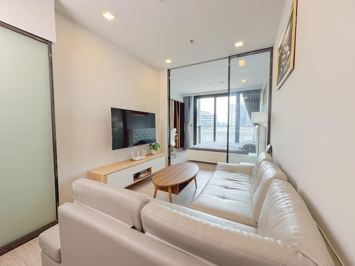 เตียงคิงไซส์พร้อมสระว่ายน้ำ สปา ห้องออกกำลังกาย และโต๊ะทำงานยืน ใกล้ MRT
