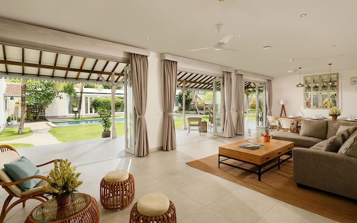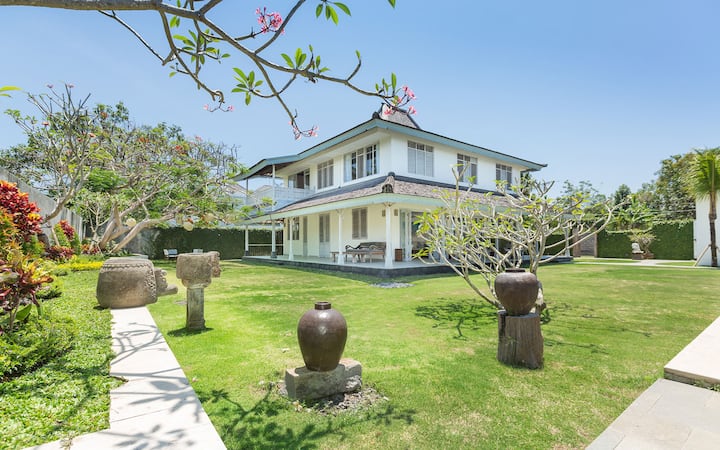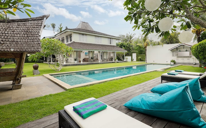วิลล่าห้องนอน 5 ห้องกว้างขวางใจกลางจิมบารัน เดินเพียง 10 นาทีจากชายหาด ที่พักส่วนตัวแห่งนี้เหมาะสำหรับครอบครัวและกลุ่ม มีสระว่ายน้ำขนาดใหญ่ ระเบียงบนดาดฟ้า และสวนเขตร้อน เพลิดเพลินกับการใช้ชีวิตแบบเปิดโล่ง ห้องนอนปรับอากาศพร้อมห้องน้ำในตัว และพื้นที่กว้างขวางสำหรับพักผ่อนหรือสร้างความบันเทิง ใกล้กับคาเฟ่ซีฟู้ด บีชคลับ และสถานที่ท่องเที่ยวที่ดีที่สุดในบาหลี เป็นตัวเลือกที่เหมาะสำหรับการเข้าพักที่สงบแต่เชื่อมต่อกัน