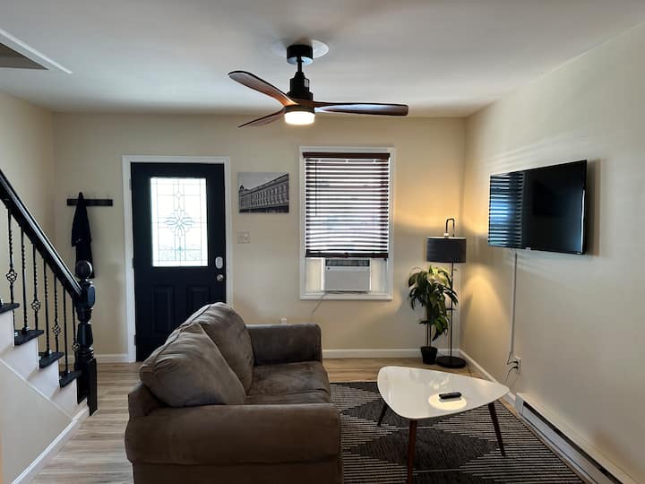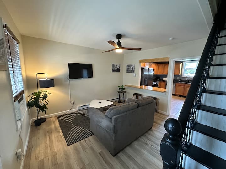 ห้องนั่งเล่นพร้อมสมาร์ททีวี Roku ห้องครัวเต็มรูปแบบบาร์อาหารเช้าแบบผ่านพื้นที่ซักรีดพร้อมเครื่องซักผ้าฝาหน้าเครื่องอบผ้าตะกร้าซักรีดและเตารีดไอน้ำ