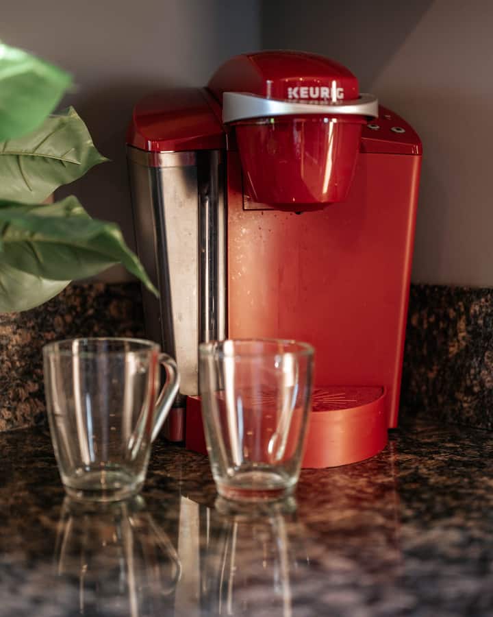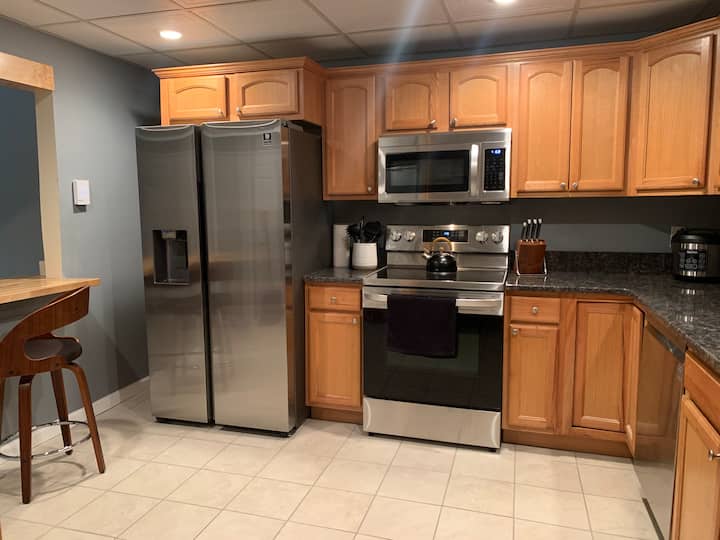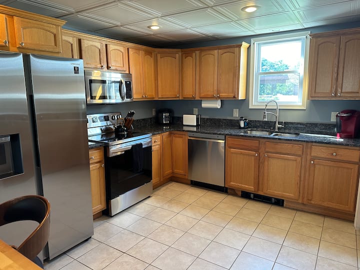 - ห้องครัวพร้อมเครื่องชงกาแฟ Keurig กาต้มน้ำร้อนเคาน์เตอร์หินแกรนิตไมโครเวฟเตาไฟฟ้า/เตาอบเครื่องล้างจานตู้เย็นพร้อมน้ำกรอง/น้ำแข็งหม้อและกระทะหม้อหุงข้าวหม้อหุงข้าวแบบช้าแผ่นอบชามผสมเขียงจานหม้อตุ๋นเครื่องครัวและเครื่องเทศพื้นฐานสำหรับอาหารปรุงสุกที่บ้าน