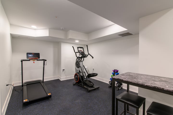 พื้นที่เพื่อสุขภาพ: เรามีอุปกรณ์คาร์ดิโอ 2 ชิ้น (เครื่องเดินวงรีและลู่วิ่ง) และชุดตุ้มน้ำหนักในบริเวณนี้