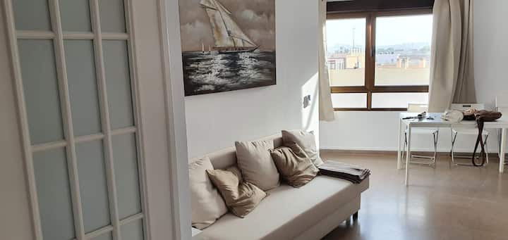 อพาร์ทเมนท์ใกล้ชายหาดซานฮวนที่ยอดเยี่ยม เป็นเซมิแมติกพร้อมระเบียงที่มีวิวทะเลและระเบียงที่มีพระอาทิตย์ตกโรแมนติก