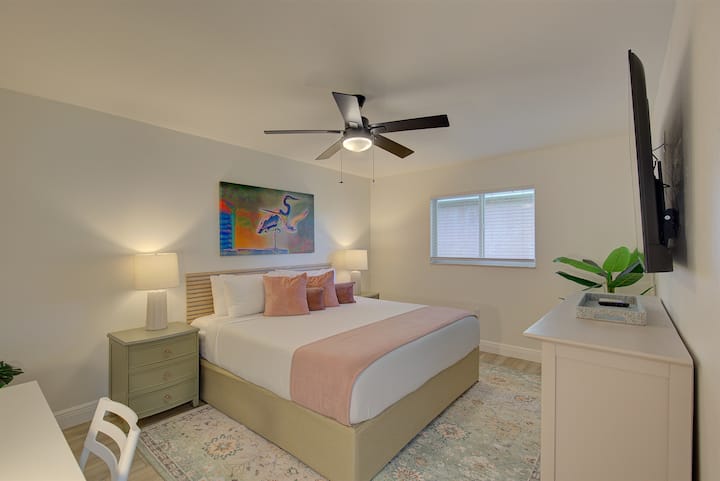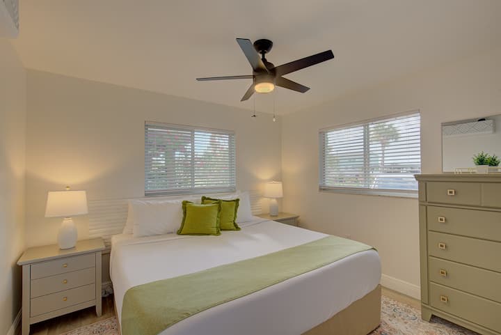 แปลนพื้นที่ออกแบบมาอย่างพิถีพิถันประกอบด้วยห้องนอนขนาดใหญ่สองห้อง เหมาะสำหรับคู่รักหรือครอบครัวที่เดินทางด้วยกัน ห้องนอนหลักเป็นพื้นที่ที่สงบ มีเตียงคิงไซส์ ตู้เสื้อผ้าแบบเดินเข้าได้ โต๊ะเครื่องแป้งขนาดใหญ่ โต๊ะทำงานสำหรับการทำงานทางไกล และสมาร์ททีวีสตรีมมิ่งขนาด 55 นิ้ว ห้องนอนสำหรับผู้เข้าพัก 2 ห้องยังมีเตียงคิงไซส์ ตู้เสื้อผ้าและโต๊ะเครื่องแป้งขนาดใหญ่ และอยู่ในตำแหน่งที่เป็นส่วนตัวและสะดวกสบาย โดยรวมแล้ว รูปแบบการจัดวางมีความสมดุลระหว่างพื้นที่ส่วนรวมกับพื้นที่ส่วนตัวที่เงียบสงบ ทำให้เกิดพื้นที่ที่ให้ความรู้สึกทั้งสูงส่งและอยู่ได้สบายระหว่างการเข้าพักในดูเนดิน ฟลอริดา