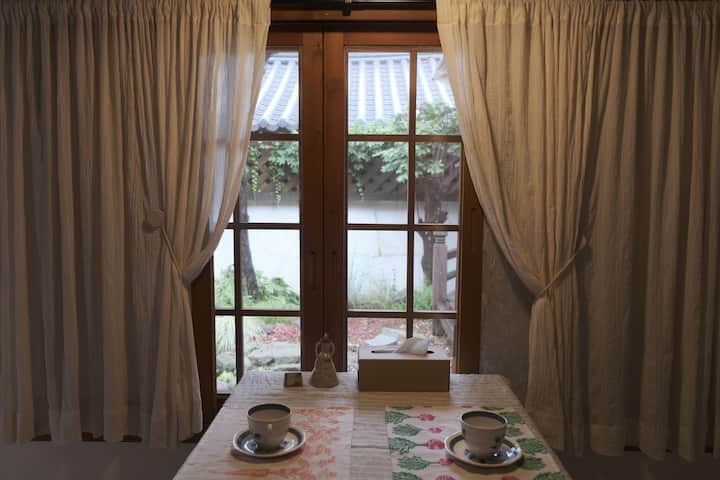 เป็นโซนถ่ายรูปที่พักที่คุณสามารถ ’ใช้เวลาทั้งวันในฮันอก' ได้ ลองทานอาหารกลางวันบนพื้นดูไหม?