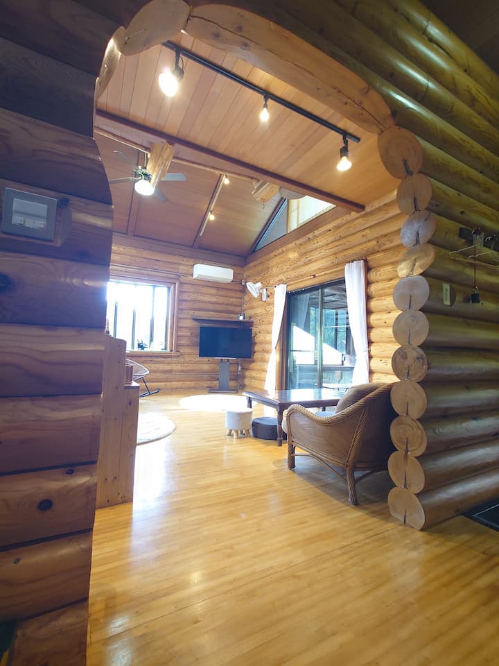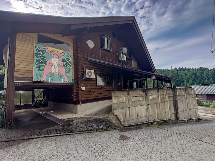 "Katsuyama Family Log House Today" เป็นบ้านไม้จริงจากหน้าต่างของห้องพักธรรมชาติที่อุดมสมบูรณ์ของคัตสึยามะกระจายออกมาและตื่นขึ้นมาพร้อมกับเสียงนกร้องยามเช้า