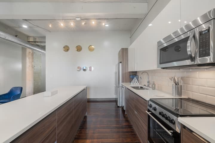 เข้าพักในลอฟท์ใจกลางเมืองที่อบอุ่นและทันสมัย! สถานที่พักผ่อน 2 ห้องนอนที่ทันสมัยแห่งนี้มีสไตล์ร่วมสมัยและความสะดวกสบายที่ไม่มีใครเทียบได้เหมาะสำหรับการเดินทางเพื่อธุรกิจการพักผ่อนกับครอบครัวหรือการเข้าพักเป็นกลุ่ม