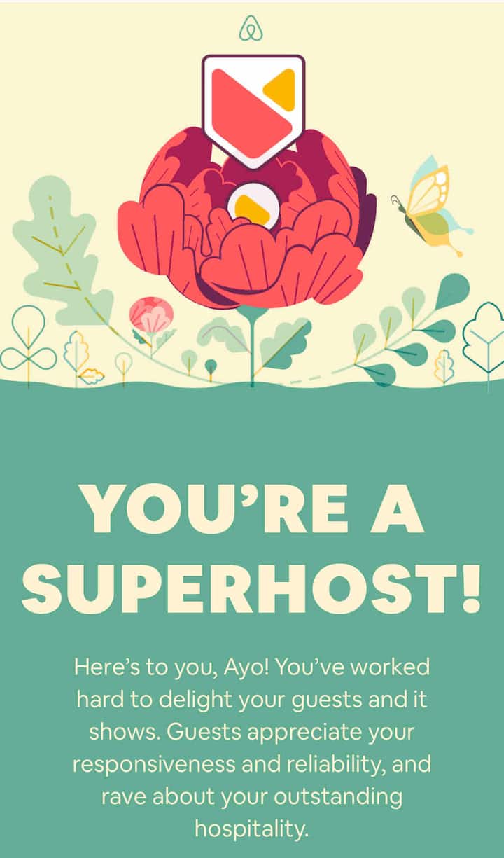 ฉันเป็นเจ้าของที่พักดีเด่นและได้รับสถานะเจ้าของที่พักดีเด่นทั้งหมด 7 ครั้งใน AIRBNB