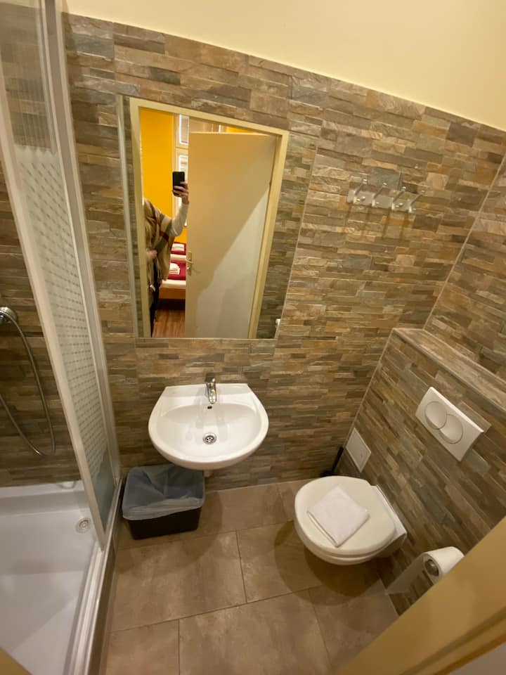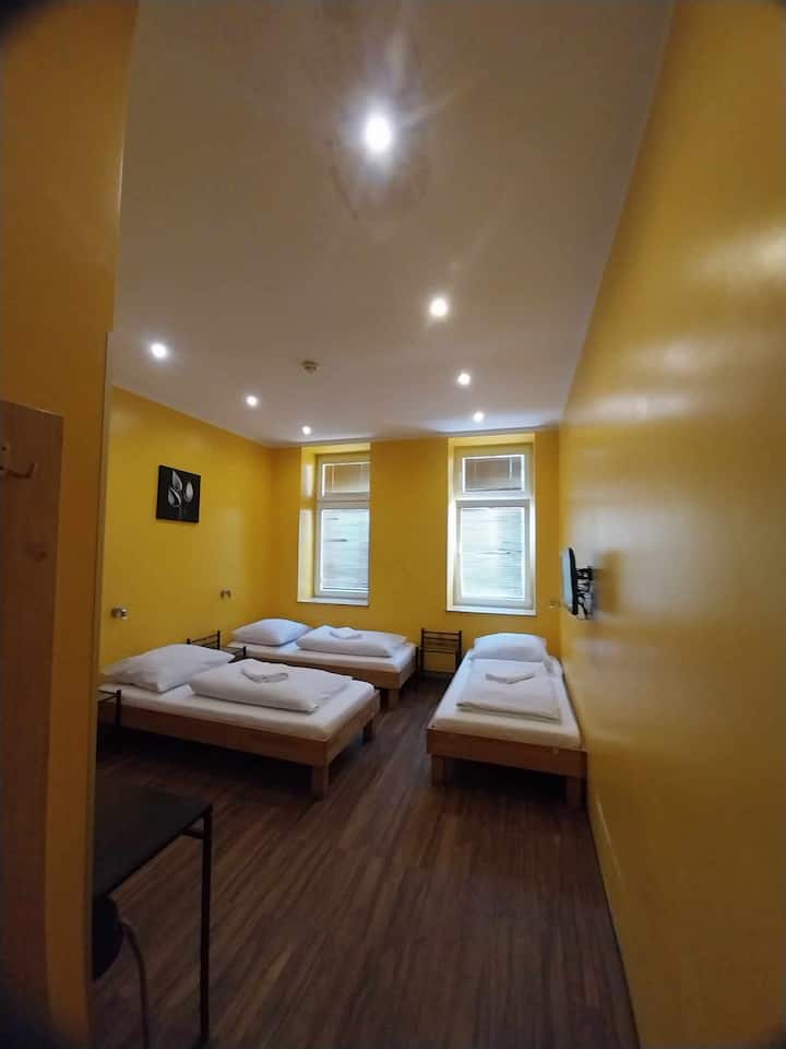ห้องพักสามเตียงพร้อมฝักบัวอาบน้ำและห้องสุขาส่วนตัว