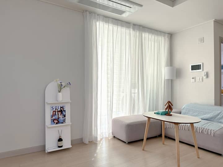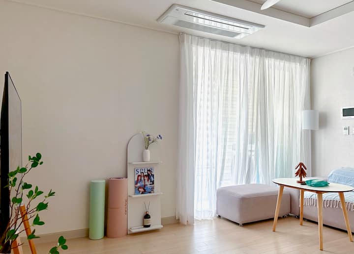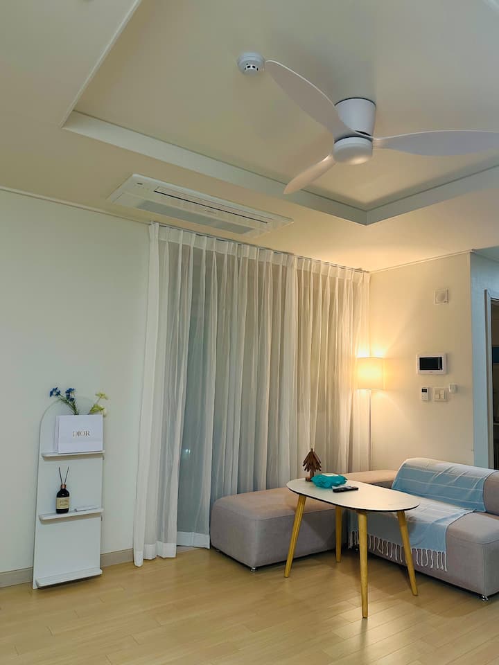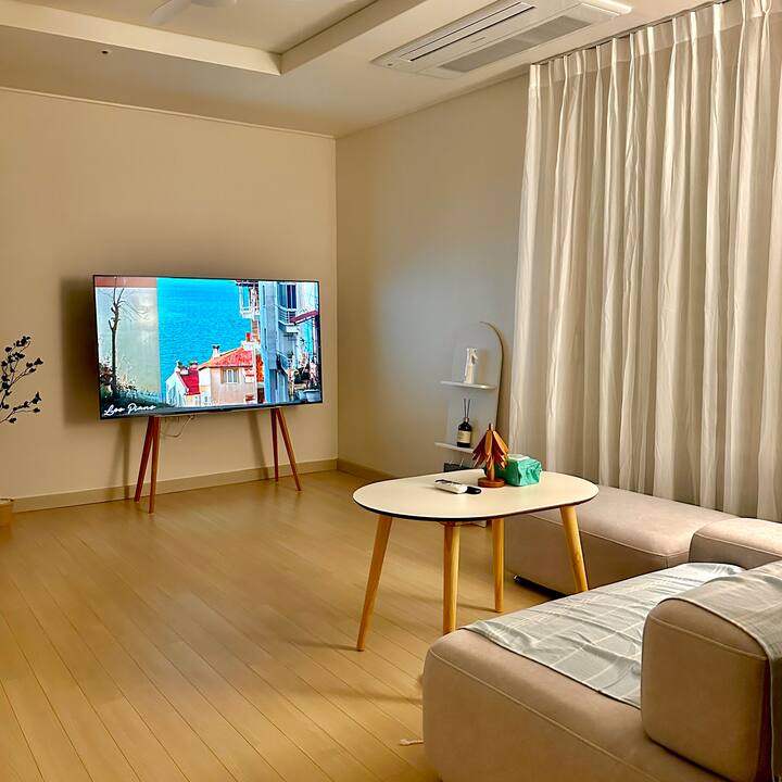 ดุนซาน ห้องนั่งเล่นกว้างขวางและห้องนอนแยกต่างหาก พื้นที่สะอาดและมีบรรยากาศดี ทีวี 65 นิ้วและเน็ตฟลิกซ์