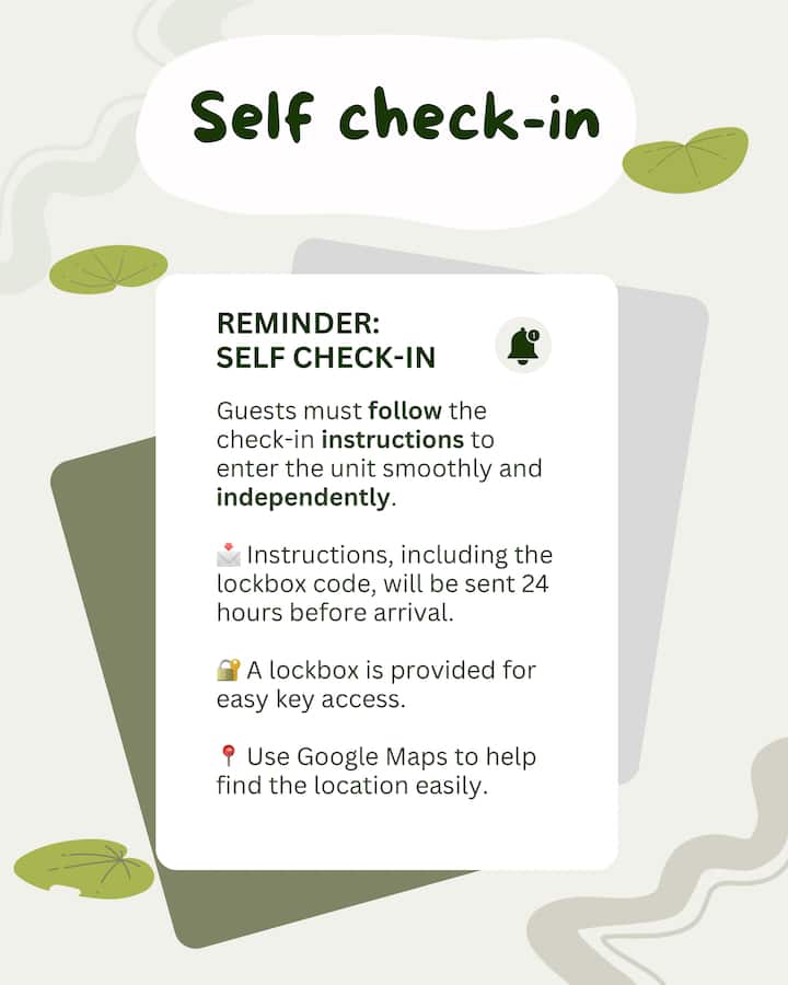คุณจะได้รับคำแนะนำในการเช็คอินอย่างละเอียดทีละขั้นตอนในกล่องข้อความ Airbnb ของคุณ 24 ชั่วโมงก่อนที่คุณจะมาถึง เพื่อให้คุณสามารถเข้าถึงที่พักได้อย่างราบรื่นและด้วยตัวคุณเอง