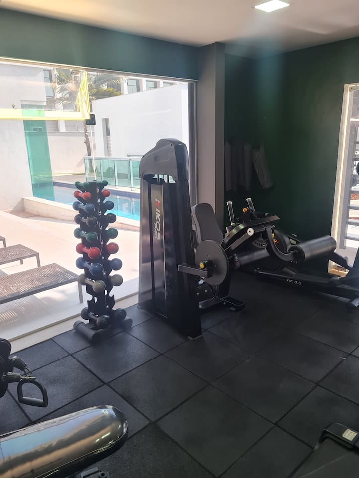 มีเครื่องวิ่งสายพาน จักรยานปั่นอยู่กับที่ เสื่อโยคะ และอุปกรณ์ยกน้ำหนักสำหรับออกกำลัง